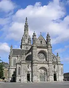 La façade principale est composée d'une triple division horizontale et verticale. La division verticale comprend, au milieu, le porche central, avec la grande porte à deux vantaux sous une profonde voussure. Puis, après la première galerie, l'étage est percé d'une grande rose. Au-dessus de la seconde galerie s'élève le grand pignon triangulaire inscrit entre deux clochetons, dont les rampants correspondent à ceux de la toiture de la nef. Au-dessus des portes latérales de cette façade sont placées dans deux niches à dais les statues en marbre, œuvres du sculpteur Alexandre Falguière qui représentent le pénitent Pierre Le Gouvello de Keriolet et Yvon Nicolazic, habillé en paysan breton. Leurs tombeaux se trouvent dans deux petits caveaux pratiqués sous le palier d'autels au fond de la basilique[21].