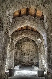 Cette solution architecturale sans contreforts est d'un grand intérêt. La solidité est obtenue par la disposition orthogonale qui distribue la pression mutuelle et réciproque dans toutes les structures, notamment dans les absides. Cette articulation du bâtiment détermine la segmentation de l'espace intérieur, dans lequel nous trouvons un espace réduit dans la nef, un autre plus ample dans la croisée et enfin un très intime dans les trois chapelles. Cette différenciation des espaces était marquée originellement par des chancels perdus, mais dont restent des marques dans les fentes pratiquées dans les murs et dans le sol, destinées à les recevoir et qui sont bien visibles en bout de nef et dans les accès aux absides[6].