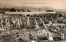 Les premières traces archéologiques de la présence chrétienne à Carthage remontent au IIIe siècle, les tombes et les vestiges matériels devenant nombreux vers 390-420[8]. Les cimetières chrétiens dits areae sont datés de la fin du IIe et du début du IIIe siècle ; une dévotion s'installe sur les lieux du fait de la présence supposée de reliques de martyrs[9]. Les sources littéraires évoquent aussi des églises ayant accueilli des conciles ou Augustin d'Hippone à partir de la fin du IVe siècle. Une trentaine de constructions liées au culte chrétien ont été retrouvées depuis les débuts de l'archéologie carthaginoise[10].
