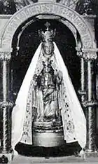 Façade de la basilique avec les armes de Benoît XVI ; à droite on aperçoit le mur de l'ancienne église de pèlerinage. | |