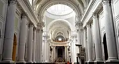 L'intérieur se compose d'une seule grande nef de 80 mètres de long, avec un transept, une tribune et dix chapelles latérales (cinq de chaque côté). À droite et à gauche de l'entrée se trouvent les deux monuments funéraires à Ambrogio Salvio et Paolo Spinelli, tous deux exécutés par Michelangelo Naccherino. La nef, dépouillée de tout élément décoratif sur la voûte et sur les murs, est rendue extrêmement solennelle par quatorze grandes colonnes corinthiennes qui soulignent le goût vanvitellien de la basilique de la Sainte-Annonciation-Majeure (Santissima Annunziata Maggiore) ; à proximité de l'entrée se trouvent deux bénitiers datant des XVIe et XVIIe siècles. Même le dôme est dépourvu de tout motif pictural-décoratif à l'intérieur, car lors de la phase de reconstruction de celui-ci par Mario Gioffredo, les cycles précédents de Luigi Rodriguez et Giovanni Bernardo Azzolino ont été perdus. Ce dernier, posé sur un autre tambour, donne de la majesté à la structure. La hauteur de la basilique dépasse 70 mètres.
