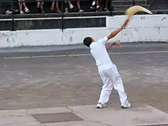 - La seconde, plus large, englobe ceux qui se considèrent comme basques mais sans être obligatoirement bascophone[1]. Pour désigner ces derniers, un néologisme a été inventé au XIXe siècle, avec le mot euskotar (ou euskotarrak au pluriel) qui signifie qu'une personne est ethniquement basque, qu'elle parle ou non le basque[16].