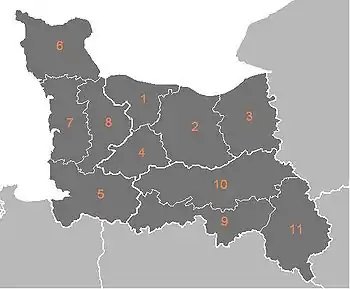 Le terme de « basse Normandie » s'applique alors à un territoire englobant les bailliages de Caen, Coutances et Alençon[6]. Cet ensemble correspond à la généralité de Caen, créée en 1542, et à une partie de la généralité d'Alençon, créée en 1637. Sur la carte de la Neustrie dessinée en 1668 par Philippe Briet, c'est la Touques qui matérialise la limite avec la Haute-Normandie[7].