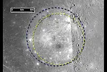 Le bassin Caloris situé dans l'ombre du terminateur. Seule la moitié est a pu être photographiée par Mariner 10. | |