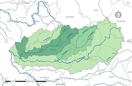 De plus, son bassin versant s'étend en partie sur cinq départements supplémentaires[6] en Nouvelle-Aquitaine : la Charente, la Charente-Maritime, la Creuse, la Haute-Vienne et le Lot-et-Garonne.