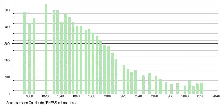 | L'évolution du nombre d'habitants est connue à travers les recensements de la population effectués dans la commune depuis 1793. Pour les communes de moins de 10 000 habitants, une enquête de recensement portant sur toute la population est réalisée tous les cinq ans, les populations légales des années intermédiaires étant quant à elles estimées par interpolation ou extrapolation[39]. Pour la commune, le premier recensement exhaustif entrant dans le cadre du nouveau dispositif a été réalisé en 2005[40]. En 2021, la commune comptait 66 habitants[Note 6], en augmentation de 6,45 % par rapport à 2015 (Lozère : +0,28 %, France hors Mayotte : +1,84 %). |