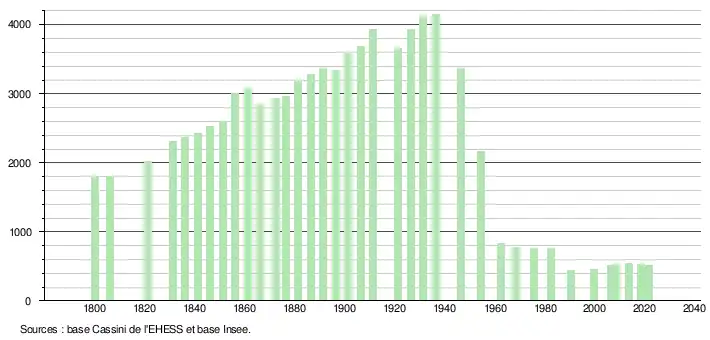 L'évolution du nombre d'habitants est connue à travers les recensements de la population effectués dans la commune depuis 1800. Pour les communes de moins de 10 000 habitants, une enquête de recensement portant sur toute la population est réalisée tous les cinq ans, les populations légales des années intermédiaires étant quant à elles estimées par interpolation ou extrapolation[8]. Pour la commune, le premier recensement exhaustif entrant dans le cadre du nouveau dispositif a été réalisé en 2008[9].