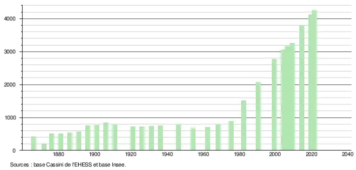 L'évolution du nombre d'habitants est connue à travers les recensements de la population effectués dans la commune depuis 1866. Pour les communes de moins de 10 000 habitants, une enquête de recensement portant sur toute la population est réalisée tous les cinq ans, les populations légales des années intermédiaires étant quant à elles estimées par interpolation ou extrapolation[11]. Pour la commune, le premier recensement exhaustif entrant dans le cadre du nouveau dispositif a été réalisé en 2004[12].