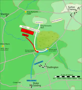 Richard rejoint Norfolk à Leicester le 20 août, et Northumberland arrive le lendemain. L'armée royale se met en marche vers l'ouest pour couper la marche d'Henri vers Londres. Passé Sutton Cheney, Richard dirige son armée vers Ambion Hill (en), estimant qu'elle pourrait avoir une importance tactique, et y établit son camp[87]. Son sommeil est agité ; selon la Chronique de Croyland, au matin son visage est « plus livide et effroyable qu'à l'ordinaire[88] ».