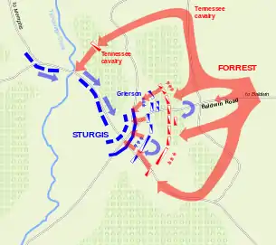 Le à 9 h 45, l'une des brigades de cavalerie de Grierson atteint le carrefour de routes poussiéreuses, nommées « Brice's Crossroads », d'après le nom de l'habitant le plus proche. La bataille débute à 10 h 30 du matin lorsque les confédérés s'opposent à l'avance des nordistes avec une de leurs brigades. Forrest ordonne au reste de sa cavalerie de converger sur le carrefour. Le reste de la cavalerie fédérale arrive en soutien, mais un assaut confédéré vigoureux les repousse à 11 h 30 du matin, alors que le reste du corps de cavalerie de Forrest (en) se présente sur les lieux. Grierson demande le soutien de l'infanterie et Sturgis y répond en faisant avancer ses troupes en marche forcée. La ligne tient jusqu'à 13 h 30, lorsque les premiers régiments d'infanterie nordistes arrivent[11].