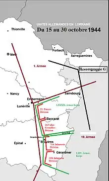 Toutefois, le commandement américain changea sa stratégie initiale et transmit de nouveaux ordres à la 7e armée US le 29 septembre 1944 : l'attaque orientée vers l'Est sur l'ensemble du front fut abandonnée au profit d'une offensive orientée vers le Nord-Est et la ville de Strasbourg[23]. Cette nouvelle stratégie répondait à de nouvelles donnes, mais aussi à un déplacement des lignes ou limites attribuées à chaque unité pour ses opérations. En effet, ce fut à la 1re Armée française que l'on confia la tâche de prendre la Trouée de Belfort. Du coup, les Américains s'étant fixé pour objectif principal la ville de Strasbourg comprirent qu'ils n'avaient pas d'autre choix que d'opérer quelques brèches dans le Massif vosgien, non seulement dans sa partie méridionale, dans les vallées de la Vologne, de la Meurthe et de la haute Moselle, mais aussi dans sa partie septentrionale et centrale avec les pays de Badonviller et Sarrebourg.