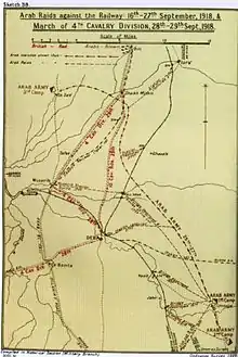 La cavalerie de l'ANZAC tient alors une ligne discontinue entre Jénine et Afoula, la 5e division de cavalerie anglo-indienne (général MacAndrew) pousse une pointe au nord et s'empare de Nazareth, sans pouvoir bloquer complètement la retraite des forces ottomanes . Allenby décide de reprendre l'offensive pour s'emparer de Damas avant que Liman von Sanders n'ait le temps de former un nouveau front entre Haïfa et la vallée du Yarmouk. La direction de l'opération est confiée au général australien Harry Chauvel. La division de l'ANZAC, qui a fourni relativement moins d'efforts pendant les précédents combats, doit avancer en tête par Tibériade, suivie par la 5e division de cavalerie. La 4e division de cavalerie anglo-indienne (en) (général George Barrow (en)) doit suivre la ligne du chemin de fer par Deraa pour arrêter les restes de la 4e armée. Entre-temps, l'armée chérifienne de l'émir Fayçal se regroupe à l'est de Deraa, autour d'Azraq, rejointe par de nombreux irréguliers locaux comme les Bani Sakhr (en). Les Arabes sabotent la voie ferrée et retardent la retraite ottomane mais ne sont pas en force pour affronter le gros de la 4e armée, encore nombreuse et bien commandée. Le lieutenant-colonel T.E. Lawrence, conseiller de Fayçal, pense que les Arabes doivent remporter une action mémorable pour peser dans la prochaine conférence de paix[5].
