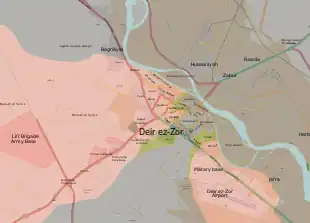 Le 17 septembre, les loyalistes reprennent le village d'al-Jafra, à l'est de l'aéroport, et atteignent les rives de l'Euphrate ; les djihadistes se retrouvent alors à leur tour presque encerclés et acculés contre le fleuve[179]. Le 18 septembre, malgré les avertissements des FDS, les troupes du régime syrien franchissent l'Euphrate au sud-est de Deir ez-Zor[180]. Le même jour, les loyalistes s'emparent de l'île d'Hawija Sakr, à l'est de Deir ez-Zor, qui est alors contrôlée à 75 % par le régime selon l'OSDH[181],[182],[183].