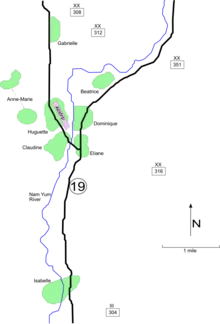 • à l’est de la rivière Nam Youm, les PA « Dominique », où se trouve la plus haute position du camp retranché (« Dominique 2 »), tenus par le III/3e RTA ;