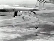 Parachutistes sautant d'un C-119 Flying Boxcar.