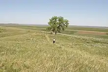 Site actuel de la bataille. Les Arapahos et les Cheyennes étaient cachés à gauche (à l'ouest) du sentier visible sur la photo, les Lakotas à droite (à l'est).