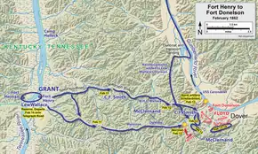 Grant et 15 000 hommes, huit batteries et les éléments d'un régiment de cavalerie, quittent Fort Henry pour gagner Fort Donelson. Les cuirassés fluviaux descendent la Tennessee pour gagner la Cumberland et participer à l'attaque[2]. Ils doivent refouler les cavaliers de N.B. Forrest qui cherchent à les ralentir.