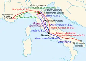 Marc-Antoine a assiégé, avec ses légions, Decimus Brutus qui s'est enfermé dans Mutina.