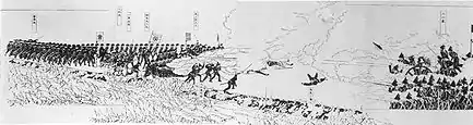 Après avoir refusé la permission aux forces du Shogun de passer paisiblement, les forces de Satsuma ont ouvert le feu sur le flanc. Ce furent les premiers coups de feu de la guerre de Boshin. Un obus de Satsuma a éclaté sur un affût de canon à côté du cheval du commandant shogunal Tomotaka Takigawa, causant sa chute et la fuite de son destrier. Le cheval effrayé a couru si sauvagement que sa panique et son désarroi se sont répercutés sur la colonne shogunale. L'attaque de Satsuma était puissante et elle a rapidement mis en déroute les troupes shogunales.