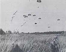 Le 19 mai à 14 h 30, la première vague française, composée de 405 hommes (le PC et trois compagnies), saute à 250 mètres d'altitude sur l'ancien aérodrome. Six hommes sont blessés par des tirs d’armes légères dès le largage, un autre, le caporal Arnold, atterrissant loin de son unité, est tué et mutilé en pleine rue, sans avoir pu se défaire de son parachute.