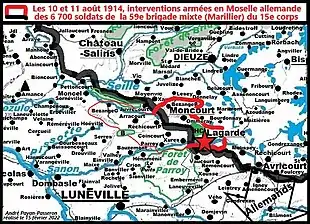 Le général Dubail va laisser les forces ennemies progresser dans son secteur[9] tandis que le général Castelnau va couvrir les incursions armées en Moselle allemande du général Lescot qui, sous les ordres de Foch, dispose notamment des 1 500 chasseurs du 2e BCP et des 4 200 « sabres » de sa 2e DC : le jusqu'à Moncourt, Lagarde et château Marimont.