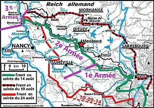 Le , Joffre précise à la 1re armée du général Dubail son axe principal d’offensive en Lorraine au départ de Baccarat sur la Meurthe. Un axe de direction du sud-ouest vers le nord-est sur 40 km jusqu’à Sarrebourg puis de direction sud-nord sur 42 km jusqu’à Sarreguemines avec une pénétration de 55 km en Moselle allemande[11]. Axe que ceux de la 1re armée de Dubail auront tendance à transformer en limite ouest aux dépens de la 2e armée et notamment de ses 15e et 16e corps.