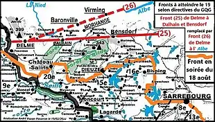 Durant cette journée du , le général Castelnau commandant la 2e armée reçoit les ordres suivants du GQG concernant la poursuite de l’offensive et le front à atteindre en soirée du . À 9 h 30, il reçoit d’abord l’ordre no 25[20] qui précise un front Delme-Dalhain-Bensdorf (noté 25 sur la carte). Mais, à 14 h, le général Castelnau reçoit l’ordre no 26[21] qui remplace le précédent : le front à atteindre est maintenant celui de Delme-Baronville-Virming-rivière Albe (noté 26 sur la carte). Un front 25 qui, en date du 19 août, est le seul mentionné et détaillé dans le JMO de la 2e armée comme dans les JMO de ses trois autres grandes unités : 68e DR (2e groupe de DR), 15e corps et 16e corps[22]. En revanche[23], la partie du front 26 « Marthille-Baronville-gare de Morhange » est celle que le général Foch a fixée[24] à ses troupes.