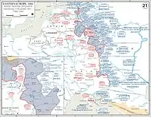 Le , l'Allemagne, la Roumanie, la Hongrie et la Slovaquie entrent en guerre contre l'Union soviétique. C'est le lancement de l'opération Barbarossa. Après avoir détruit une large partie des avions au sol, les forces allemandes progressent rapidement en employant les tactiques du Blitzkrieg. Les unités motorisées avancent en réalisant de gigantesques encerclements et en détruisant plusieurs armées soviétiques. Tandis que le groupe d'armées Nord progresse vers Leningrad, le groupe d'armées Sud prend le contrôle de l'ouest de l'Ukraine et le groupe d'armées Centre avance vers Moscou. Les défenses soviétiques sont submergées et les pertes subies par l'Armée rouge sont considérables.