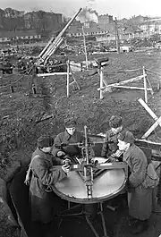 Moscou aussi se transforme en forteresse. Selon les historiens[31] et d'après Joukov[réf. nécessaire], 250 000 femmes et adolescents construisent, à l'intérieur et autour de Moscou, 8 000 km de tranchées[31] et des fossés antichars, déplaçant près de 3 000 000 m3 de terre sans aide mécanique[alpha 5]. La ville et sa banlieue se hérissent d'obstacles en tous genres : chevaux de frise, hérissons tchèques, barricades, ballons anti-aériens entre autres.
