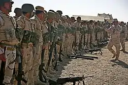 Les milices des Hachd al-Chaabi, pour la plupart armées, financées et conseillées par l'Iran[86], prennent également position sur la ligne de front à Qayyarah, à 60 kilomètres au sud de Mossoul[84], avec notamment l'Organisation Badr[87],[88],[50], les Brigades de la paix[88],[50], Asaïb Ahl al-Haq[87],[88], les Kataeb Hezbollah[50], le Harakat Hezbollah al-Nujaba[87],[89],[90], les Brigades de l'imam Ali[91],[92], Saraya al-Khorasani[93], Saraya Ansar al-Aqeeda[94], le Liwa al-Tafuf[95], Saraya al-Djihad[92] et le Liwa Ali al-Akbar[96]. Leur commandant opérationnel dans la région est Abou Mountadhar Al-Hosseini[97],[92] et elles sont épaulées par des conseillers militaires iraniens du Corps des Gardiens de la révolution islamique[92],[86]. Le gouvernement irakien ne tient cependant pas à ce que ces forces, responsables d'exactions contre le sunnites, entrent dans Mossoul ; elles ont pour objectif de faire mouvement vers la ville de Tall Afar, située à l'ouest[86],[87].