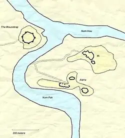 Muong Khoua (tenu par la 16e compagnie du 6e bataillon de chasseurs laotiens[3] et commandé par le capitaine Teullier) avait un camp satellite à Sop-Nao (commandé par le lieutenant Grézy). Muong Khoua était situé à la confluence des rivières de Pak Nam et Nam-Hou, à 64 km de Điện Biên Phủ, et à environ 160 km au sud-ouest de la rivière Noire au Vietnam[2]. L'avant-poste lui-même se composait de trois bastions, appelé la Souricière, Pi et Alpha, situés sur trois collines à l'ouest, au sud-sud-est, et sud-sud-ouest du confluent de la Nam Hou et Nam Pak. Chacun était distant d'environ 200 m des autres, formant un triangle. Le village de Muong Khoua s'élevait à l'ouest et au pied de la Souricière, protégé de la rivière par un grand banc de sable, et à cheval sur la route de Phong Saly, un autre avant-poste français, à 80 km au nord[1].