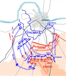 L'armée sudiste est arrivée le devant Nashville. Son effectif étant trop faible pour espérer emporter de vive force son objectif, Hood choisit de prendre une posture défensive et d'attendre l'attaque nordiste qui ne manquera pas de se produire. Il sera alors en mesure d'obtenir, en inversant les rôles, le résultat de la bataille de Franklin : l'attaquant sera décimé par le feu du défenseur. Et ce dernier pourra ensuite s'emparer de la ville[2].
