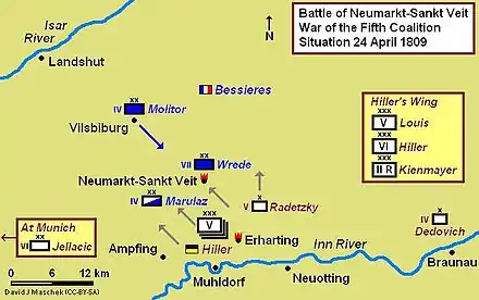 Informé de la défaite de Neumarkt, Napoléon ordonna au maréchal Lannes de soutenir Bessières avec un corps de 25 000 hommes. L'armée autrichienne se retirait alors vers l'est[17]. Le IVe corps de Masséna fut dirigé sur Passau tandis que Bessières et Lannes empruntèrent une route plus au sud[19]. Ces dispositions débouchèrent sur la bataille d'Ebersberg le [20].