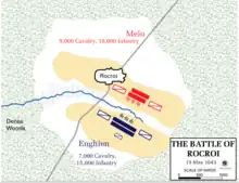 La bataille de Rocroi a lieu le pendant la guerre de Trente Ans. Elle met aux prises l’armée des Flandres, armée espagnole commandée par Francisco de Melo, qui assiégeait Rocroi, et l’armée de Picardie, armée française menée par Louis de Bourbon, duc d'Enghien (le futur Grand Condé). C'est une importante victoire française, qui marque la fin de la suprématie militaire des tercios espagnols et le début du renversement de l'équilibre des forces en Europe.