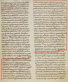 La mention du préfet de la marche de Bretagne à côté de deux hautes personnalités connues par ailleurs, fait pourtant l’objet de controverses depuis le premier quart du XIXe siècle quand il a été découvert que tous les manuscrits de la Vita Karoli ne la contiennent pas[68],[note 12]. Ceux-ci ont été classés en plusieurs catégories dites A, B puis plus tard C, en fonction de détails mineurs de rédaction tels que la dédicace à Louis le Pieux, le chapitrage ou encore justement la mention de Roland dans le chapitre 9[69]. Le médiéviste suisse André de Mandach va jusqu’à proposer en 1961 que le nom de Roland, absent des manuscrits de type B supposés alors être les plus anciens, ait été ajouté au texte quatre siècles après sa rédaction initiale[70]. Des études épigraphiques ultérieures suggèrent cependant que les trois types de manuscrits datent des mêmes années 820, laissant supposer qu’Éginhard ait produit plusieurs versions de son œuvre, par exemple pour une première lecture ou pour des corrections[69].