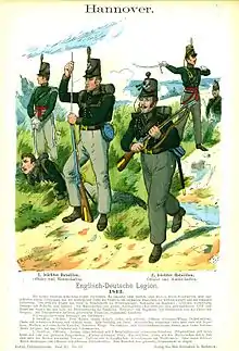 La division Sarrut était articulée en deux brigades sous le commandement respectif des généraux Joseph François Fririon et Jean-Baptiste Pierre Menne, avec une batterie d'artillerie attachée, soit un total de 146 officiers et 4 656 hommes du rang. La brigade Fririon comprenait le 2e léger et le 36e de ligne tandis que la brigade Menne était formée du 4e léger et du 65e de ligne[21]. La division Howard, pour sa part, regroupait la 1re brigade d'Edward Stopford (en) (1 728 hommes), composée d'une compagnie du 5e bataillon du 60th Regiment of Foot et du 1er bataillon respectif des 2nd et 3rd Foot Guards, et la 2e brigade de Colin Halkett (3 126 hommes), comprenant les 1er et 2e bataillons légers ainsi que les 1er, 2e et 5e bataillons de ligne de la King's German Legion[22].