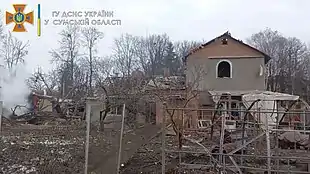 Dans la nuit du 7 au , un bombardement aérien frappe une rue résidentielle à Soumy. Les autorités ukrainiennes recensent au moins 21 morts, dont deux enfants[9].