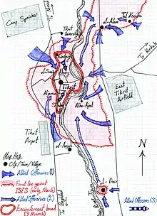Le , les forces gouvernementales irakiennes engagent 27 000 hommes — troupes régulières irakiennes mais surtout milices chiites et milices tribales sunnites loyalistes[23] — dans une offensive sur Tikrit, Al-Dour ou Ad-Dawr au sud et Al-Alam au nord[24],[1]. Il s'agit alors de leur 36e offensive contre Tikrit[25]. Mais comme dans les précédentes tentatives, les forces irakiennes piétinent, ralenties par les sniper de l'EI et de nombreux engins explosifs improvisés[26],[27]. Le , l'armée irakienne parvient à entrer dans Al-Dour, au sud de Tikrit[28]. Le 8, elle s'empare du village d'Albou Ajil, à l'est de la ville, et les djihadistes se replient sur Al-Alam. Le , l'EI fait exploser à l'est l'unique pont de la région qui enjambe le fleuve Tigre, afin de ralentir la progression des troupes irakiennes. Par ailleurs ces dernières prennent le même jour le contrôle du centre d'Al-Alam, dans les faubourgs nord de Tikrit, et encerclent complètement Al-Dour à l'ouest[29],[30].