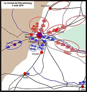 La bataille de Wissembourg également appelée bataille du Geisberg ou encore bataille de Wissembourg-Geisberg est la première bataille de la guerre franco-prussienne de 1870 qui eut lieu le , sur la frontière nord de l'Alsace au même endroit que les première et deuxième batailles de 1793[1]. Les combats de l'avant-veille autour de Sarrebruck n'avaient engagé que de faibles contingents. C'est un combat de rencontre où le commandement français, par manque d'information se laisse accrocher par un ennemi supérieur en nombre.