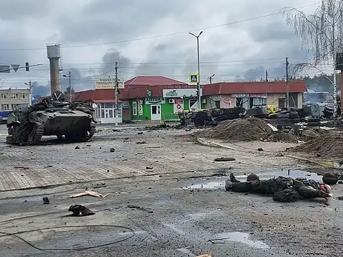 Les combats se poursuivent aux alentours de Hostomel et des communes de Boutcha et Irpin, dans la banlieue de Kiev, où l'offensive de Kiev s'est immobilisée. Ils provoquent des destructions importantes, des victimes civiles et de nombreux déplacés[29]. Le , le commandant ukrainien Valeriy Tchybineyev, titulaire de l'ordre des Héros d'Ukraine, fait partie des morts au combat[30].