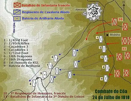 L'attaque sera encore plus forte que prévu. Au matin du 24 juillet, lorsque la cavalerie française, qui marchait en tête, a mis en fuite les patrouilles de la cavalerie britannique et les postes avancées lancés par le 95e Rifles, puis que des tirs de carabines et de fusils se sont fait entendre, les cinq bataillons d'infanterie de la division légère ont rapidement occupé les positions de combat. Ils ont alors formé une ligne appuyant leur flanc gauche contre un moulin situé sur la partie la plus élevée au sud-est d'Almeida, à près de 600 mètres des murailles et s'étendant vers le sud le long de la route de Junca. L'artillerie d'Almeida soutenait le flanc gauche du dispositif anglo-portugais.
