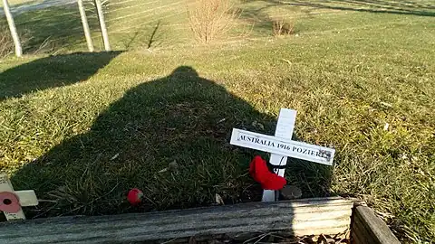 La guerre repassa sur cette crête en 1918. Bien des hommes qui se sont battus et ont perdu la vie en 1916 restent enterrés ici à jamais ; inconnus, mais non oubliés de leur Patrie, l'Australie. »