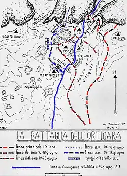À 6h00, les hommes de la 52e division sortent également des tranchées et se lancent à l'assaut de la cote 2 105 en trois colonnes: la colonne Cornaro attaque par le sud-est, tandis que la colonne Di Giorgio, qui, avec les bataillons alpins, compte également des fantassins des 3e et 4e Régiments de la Brigade "Piemonte" et du 9e Régiment de Bersaglieri, attaque par l'est et le nord-est, en partant des positions conquises de la cote 2 101. En quarante-cinq minutes, la cima Ortigara, que l'on croyait imprenable, est conquise de plusieurs côtés mais les troupes alpines, fatiguées et décimées, ne sont pas en mesure de poursuivre immédiatement l'avancée pour occuper le monte Campigoletti, se diriger vers la cima Portule et reconquérir le plateau pour obtenir un succès tactique complet[36]. La colonne qui, du sommet nord de la montagne, se dirigeait vers le col de Caldiera fut bloquée avant une altitude de 2 060 mètres par le feu de l'ennemi; les troupes qui avaient réussi à s'établir sur le sommet principal ne purent avancer, malgré le résultat positif des premiers sauts, en direction du mont Campigoletti. Le brassage des divisions[37], les tirs d'interdiction austro-hongrois et le manque d'audace des commandements tactiques les empêchèrent d'exploiter la grave crise créée dans la ligne austro-hongroise, malgré le fait que les commandants de celle-ci craignaient aussi depuis longtemps pour la Cima Dieci et la Cima Undici derrière.