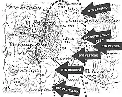 - Dans la nuit, les bataillons "Tirano" et "Spluga" montent jusqu'à l'altitude de 2 101 "Lepozze", mais subissent de lourdes pertes lors de la traversée du Vallone della Morte, éclairé pour l'occasion par des fusées éclairantes ennemies. Voir: Pieropan 2009, p. 306.