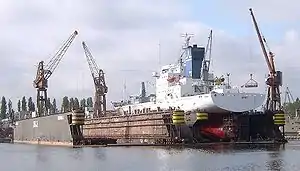 Safran d'un navire en cale sèche au chantier de Remontowa à Gdańsk en Pologne.