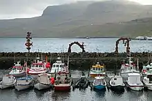 Flottille de pêche aux îles Féroé, mêlant chalutiers modernes à l'arrière-plan et embarcations traditionnelles à l'avant-plan.