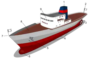 Quelques éléments constitutifs d'un bateau ponté : 1- cheminée - 2- arrière, poupe ou "cul" - 3- hélice devant le safran - 4- bordé de la coque - 5- ancre - 6- bulbe d'étrave - 7- avant, proue ou étrave - 8- pont ou gaillard d'avant et 9- superstructure.