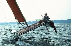 Catamaran « Tornado » à la gîte : la stabilité est assurée par l'écartement entre les coques.