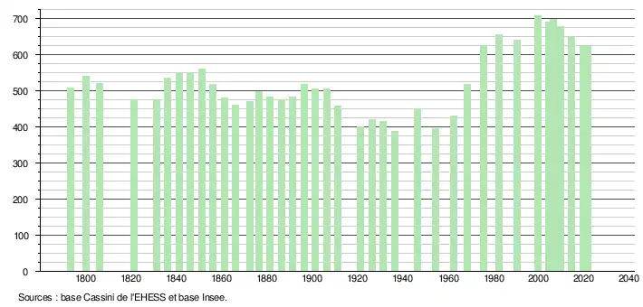 L'évolution du nombre d'habitants est connue à travers les recensements de la population effectués dans la commune depuis 1793. Pour les communes de moins de 10 000 habitants, une enquête de recensement portant sur toute la population est réalisée tous les cinq ans, les populations légales des années intermédiaires étant quant à elles estimées par interpolation ou extrapolation[31]. Pour la commune, le premier recensement exhaustif entrant dans le cadre du nouveau dispositif a été réalisé en 2004[32].