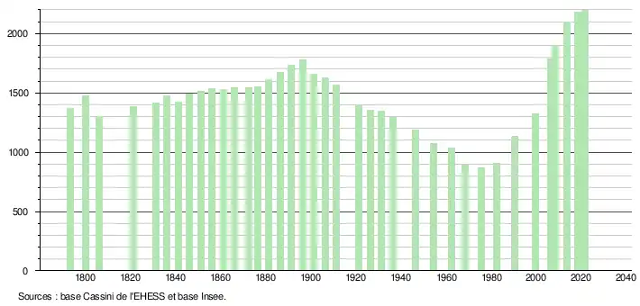 L'évolution du nombre d'habitants est connue à travers les recensements de la population effectués dans la commune depuis 1793. Pour les communes de moins de 10 000 habitants, une enquête de recensement portant sur toute la population est réalisée tous les cinq ans, les populations légales des années intermédiaires étant quant à elles estimées par interpolation ou extrapolation[39]. Pour la commune, le premier recensement exhaustif entrant dans le cadre du nouveau dispositif a été réalisé en 2008[40].